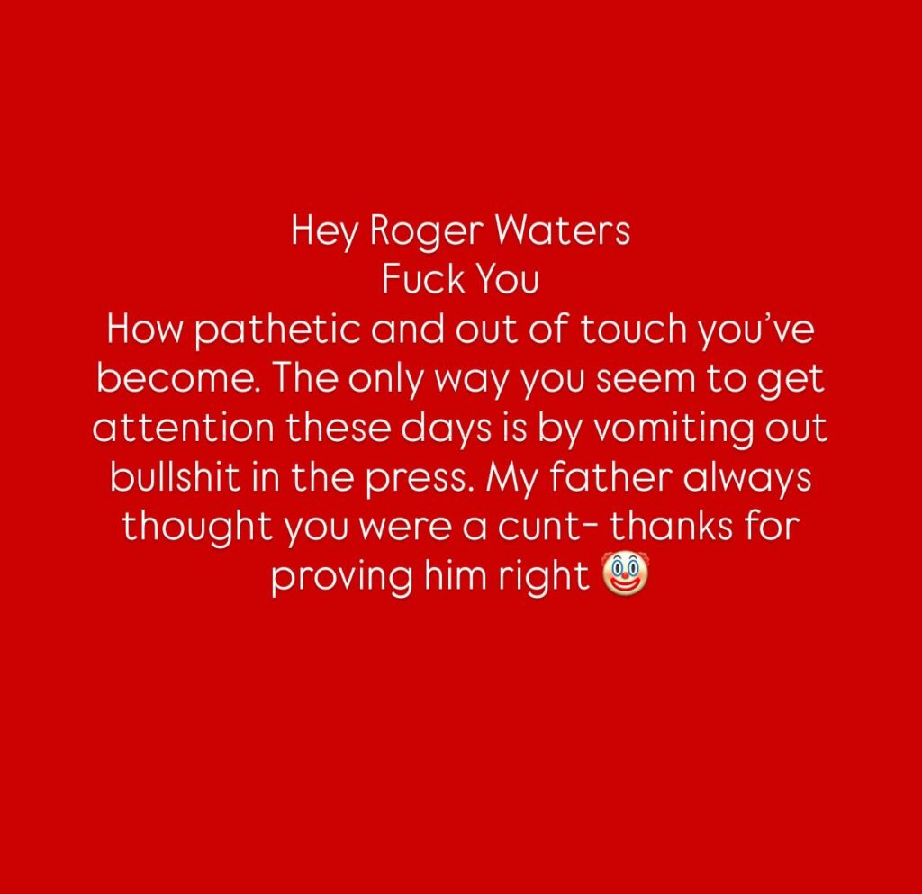 „Idehallgass Roger Waters! Először is, húzz a picsába! Hogy lehetsz ennyire szánalmas és tapintatlan egyszerre, az utóbbi időben csak azzal tudsz kitűnni, ha időnként teleokádod a sajtót valami mocsokkal. Apám mindig is tudta rólad, hogy egy faszfej vagy és köszönöm neked, hogy ezt most is bebizonyítottad!”