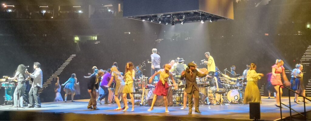 Szombaton este 8-ra már nagyjából mindenki bejutott az MVM Dome-ba, aki Presser Gábor, azaz Pici bácsi koncertjére érkezett. Negyed 9 körül, a két évvel ezelőttihez hasonlóan a helyszín közepén elhelyezkedő színpad körül megjelentek a Földessy Margit Tanoda és a Fitos Dezső Társulat tagjai, akiknek öltözéke a hippikorszakot idézte, és lelkesítő mozdulatokkal, tapsoltatással igyekeztek hangulatba hozni minket.