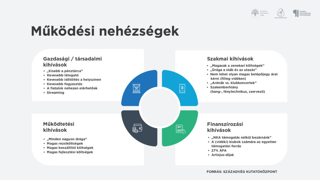 A kutatási eredmények átfogó képet adnak arról milyen nehézségekkel kell megküzdeniük az élőzenei helyszíneknek a COVID19-járványt követően. Az interjúalanyok elmondása alapján négy témakörbe rendeződő kihívásokból fakadnak: működési-, gazdasági/társadalmi-, szakmai-, illetve finanszírozási kihívások. A rezsi- és beszállítói költségek növekedése, a csökkenő látogatottság és a fellépések elmaradása sok klubot működési modelljének újragondolására kényszerített. A klasszikus klubműfajok túl szükséges volt bővíteni a repertoárt, így megjelentek az élményfókuszú formák: az after partyk, a gasztronómiai rendezvények és a minifesztiválok. A kutatás egyaránt kitér a fővárosi és vidéki klubszíntérre.