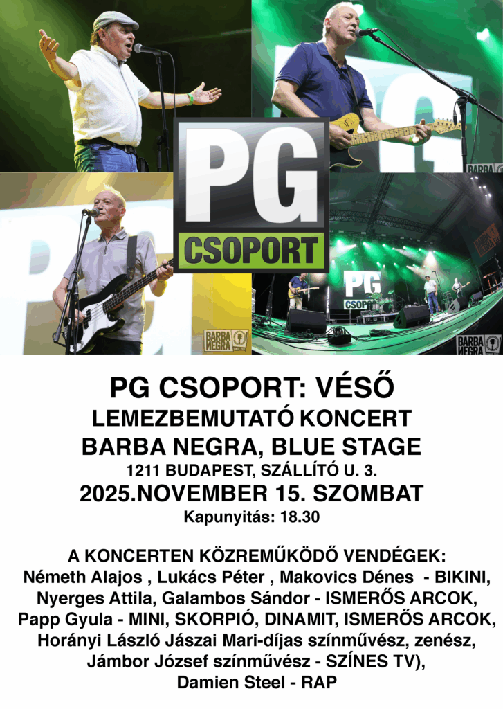 A PG Csoport egy Debrecenből indult zenekar, eredeti gondolataikkal és zenéjükkel folyamatosan jelen vannak a magyar könnyűzenei életben. A szakma és generációjuk közönsége ismeri és nagyra tartja őket. Legendás lemezeik közül a „Félélet” és az „Útlevél, fogkefe”, vagy a „Nem sietünk sehová” a legismertebbek. Barátság és közös munka fűzi őket Németh Lojzihoz (Bikini), basszusgitárosuk volt néhány évig Lukács László a Tankcsapdából, zenéltek lemezen és koncerteken Tátrai Tiborral is. Az együttes sokszor bejárta már az országot, de eljutottak koncertjeikkel Erdélybe, Oroszországba, Csehországba, Lengyelországba, Hollandiába, Svájcba, Franciaországba, Olaszországba, Angliába, és az USA-ba is. Több, mint 300 zenekar közül megnyerték a Marlboro Rock-in-t /tehetségkutató/ itthon és a svájci világ-gálán olyan sztárokkal léphettek fel, mint Bob Geldof, Neil Young és Pearl Jam, vagy Gery Moore. Szomjas György Kossuth-díjas filmrendező (A Kopaszkutya rendezője) : „Alföldi Rock” címmel forgatott róluk filmet.