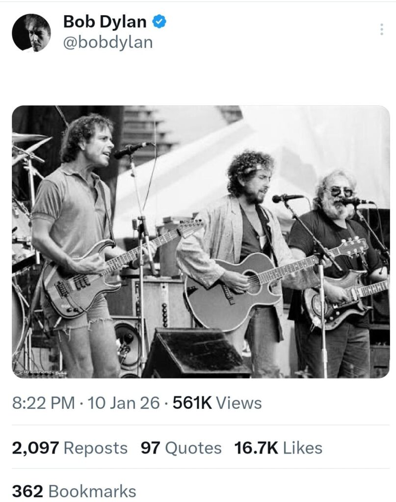 Bob Dylan egy olyan képet rakott ki az X-re ahol ő, Jerry Garcia és Bob Weir látható egy koncerten.