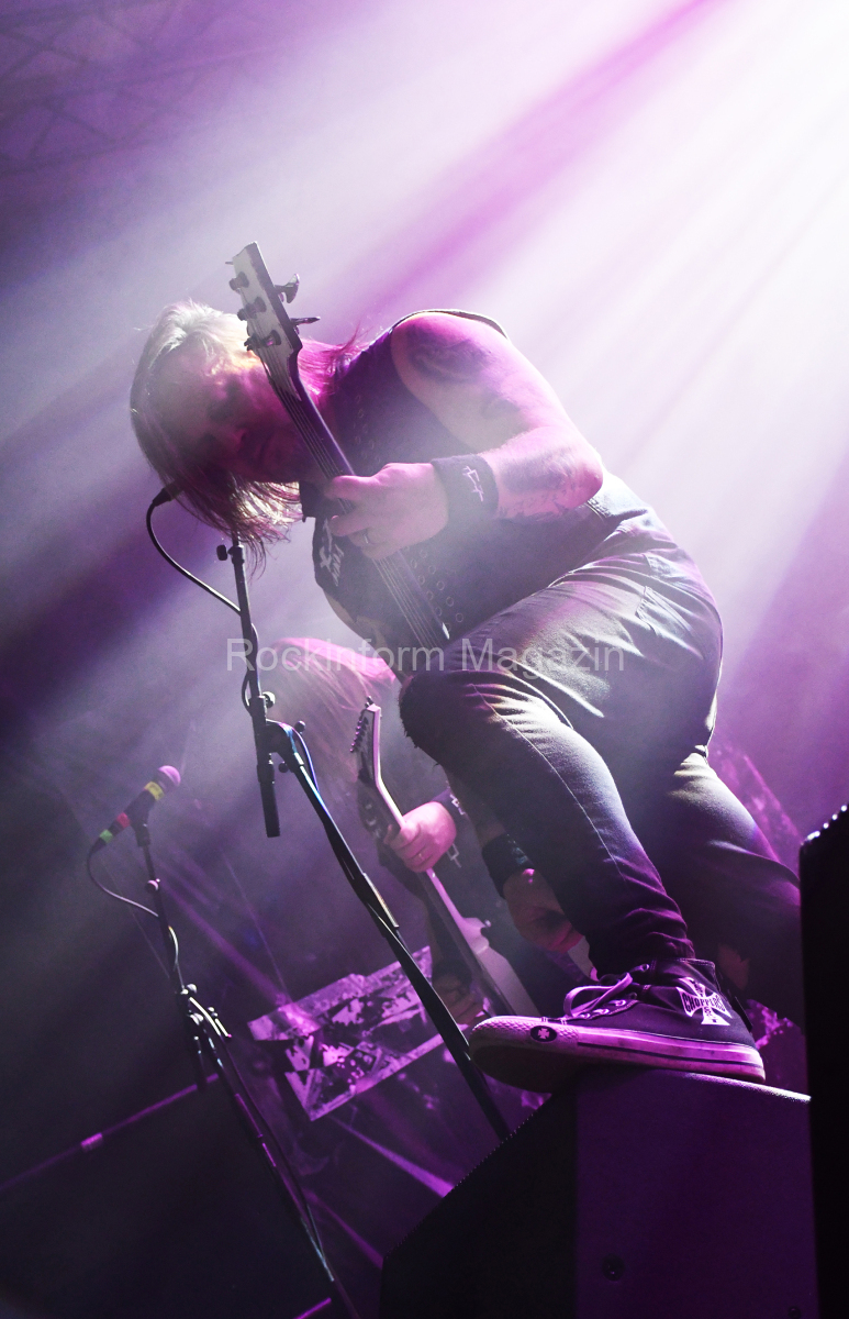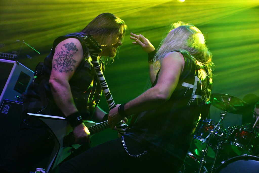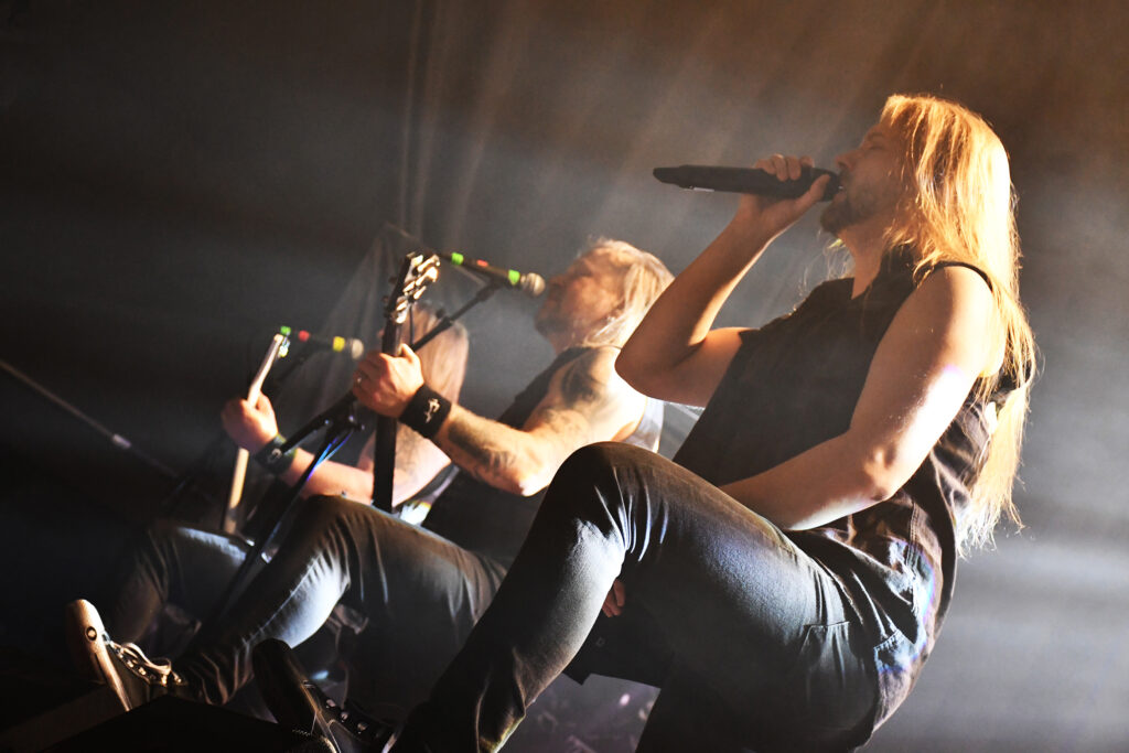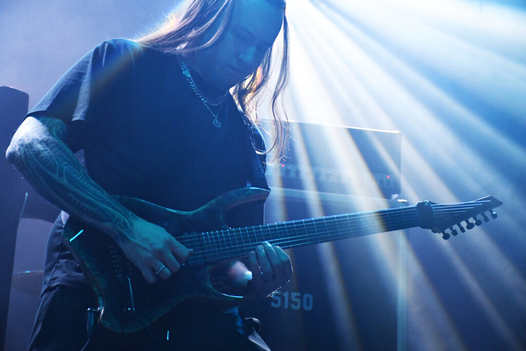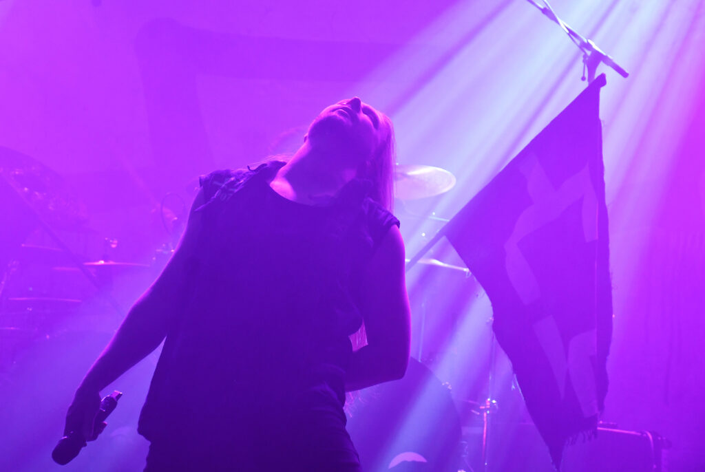 Az este fő produkciója is újdonság volt számomra. Már egy ideje kerülgetjük egymást a finn Omnium Gatherum-al. Lemezen már évek óta kóstolgatom őket, tavalyi friss albumuk a May the Bridges We Burn Light the Way is kiválóan sikerült, de élőben valahogy mindig elkerültük egymást, holott 2011 óta rendszeresen koncerteznek nálunk, utoljára a 2023-as Ultima ratio fesztiválon a Paradise Lost és a Primordial előzenekaraként. Pechemre az első találkozásunk kicsit felemásra sikerült, lévén, hogy egészségügyi problémák miatt a finnek egyik fő arca, az énekes Jukka nem tudott részt venni a turné ezen részén. A helyettesként beugró Henry Hamalainen (Shaed Empire) így utólag nézve is jól teljesített, ha nem tudom, hogy nem ő az eredeti énekes, még azt is mondtam volna, teljesen beilleszkedett a bandába. Egy pillanatra sem éreztem a helyettesítő jelleget. Hozta, amit kell, vitte a hátán a bulit, ahogy az egy frontemberhez illik, le a kalappal, szép teljesítmény volt. Talán csak annyit jegyeznék meg, hogy hangja jóval közelebb állt Johan Hegg orgánumához, így néha kicsit Amon Amarthosra sikerült a produkció emiatt, de ez legyen a legnagyobb bajunk. A beugrós énekesen kívül az egyetlen alapító tag, Markus Vanhala jelenlétét szeretném kiemelni még, látványos gitárjával, színpadi rutinjával igazi alappillére a bandának, élőben is egyértelműen ő vitte a prímet a zenészek közül.