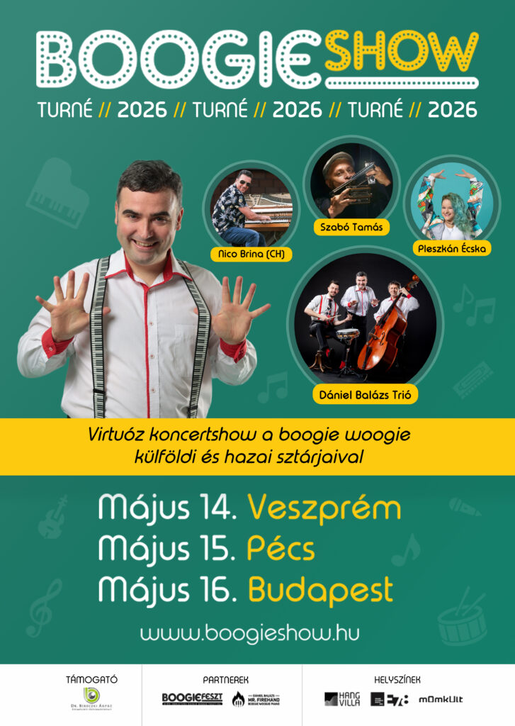 A több mint egy évtizede teltházas előadásokat maga mögött tudó koncertsorozat idén országos turnéra indul. A boogie woogie sodró lendülete eddig kizárólag a győri közönség számára volt elérhető, most azonban a virtuóz dallamok és a zene felszabadító energiája Veszprémben, Pécsen és Budapesten is a színpadra költözik A Boogie Show több mint egy koncert: egyetlen estén belül ötvözi a zenei időutazást, az egész estés szórakozást és a virtuóz hangszeres tudást. A műfaj gyökerei az amerikai blues és korai jazz világába nyúlnak vissza, ám színpadi formájában dinamikus, mai koncertélményt kínál. A boogie woogie a zongorázás egyik legösszetettebb és leglátványosabb formája: a bal kéz megállíthatatlanul gördülő ritmusa fölött a jobb kéz dallamai szikráznak. Az improvizáció pedig garantálja, hogy minden előadás egyedi legyen. A technikai bravúrok mellett hangsúlyos szerepet kap a humor és a közvetlen színpadi jelenlét is a kétrészes estén. Egyszerre három zenész egy bőgőn? Dal közben hangszert cserélnek a művészek? Extrém tempójú boogie woogie futamok pörögnek a zongorán? Ezek a kis csavarok, váratlan fordulatok adják a Boogie Show különleges ritmusát és lendületét, ami minden előadást élménnyé varázsol. A koncert energiája minden alkalommal tapintható: a trió egyik korábbi győri fellépésén az egyik néző annyira ütötte a lábával a ritmust, hogy a cipőtalpa végül levált. A zene szó szerint nyomot hagyott.